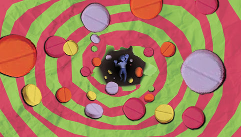 He sees himself bringing a glass of water to his mouth. He is carried away by the current and falls into his own mouth amidst a rain of anesthetic pills. He falls into an endless spiral.